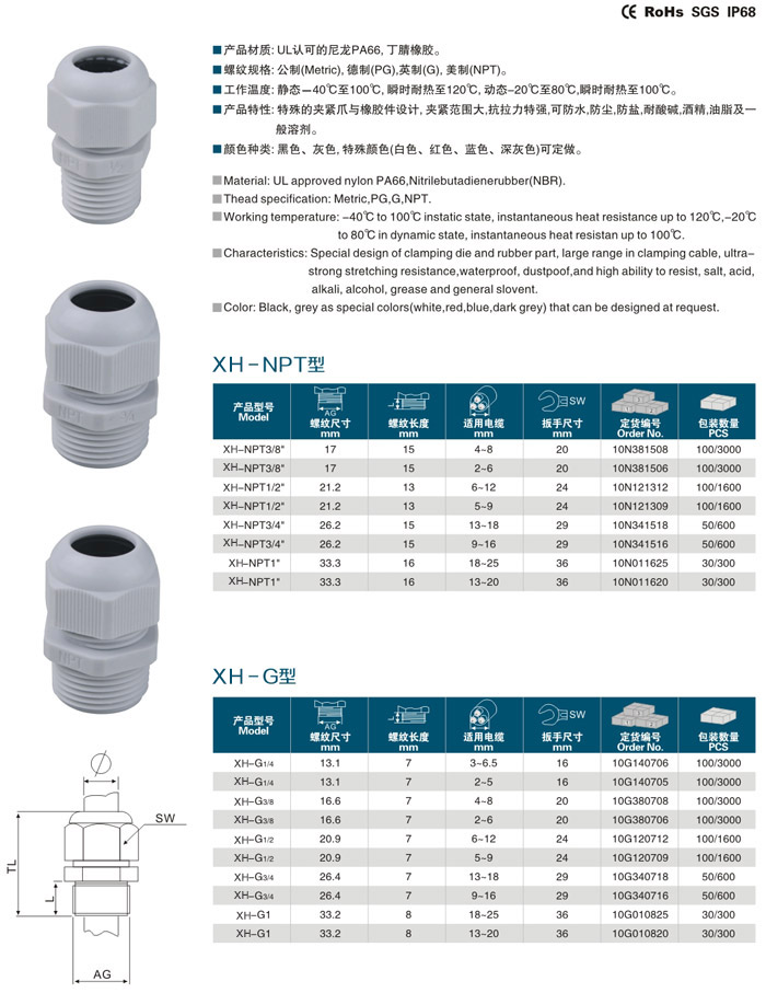 產品材質:UL認可的尼龍PA66,丁腈橡膠